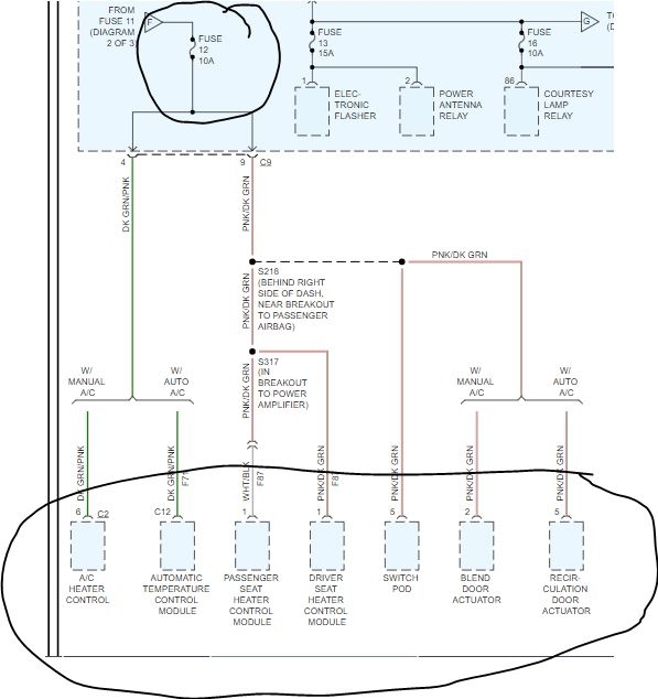 With lab scope as in step 10) , backprobe blower motor control circuit at blower motor controller 3-pin connector with blower motor switch in HI (manual override) and mode select switch in defrost mode. The lab scope pattern should be flattened.