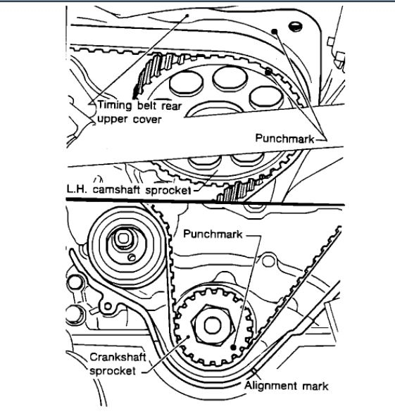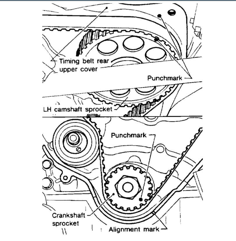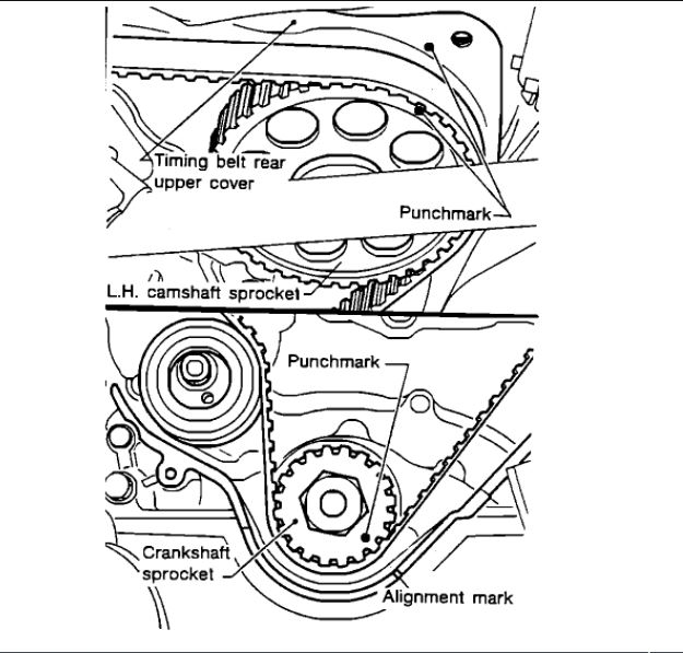 a Align punchmark on L.H. camshaft sprocket with punchmark on timing belt upper rear cover.