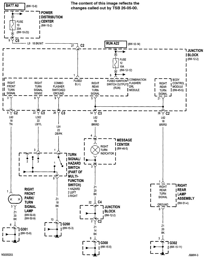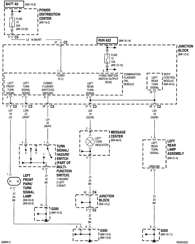 There's two diagrams for the turn signals. The second one is after a service bulletin was performed. Where I would start is by checking for 12 volts on the test points on top of both fuses. Fuse 10 is in the under-hood fuse box, (Power Distribution Center). If that one has a clear plastic cover, you'll need to remove that fuse, and test it for continuity. I can help with that if you don't know what that means. With that fuse out, one of the terminals in the fuse box must have 12 volts all the time.