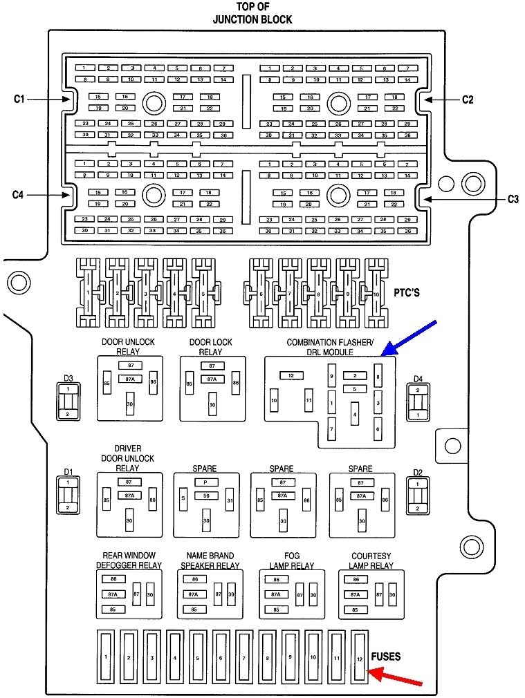 Next, check on fuse 12 in the Junction Box. That sits under the dash, right in front of the brake pedal. You'll find two test points on top of that one. You must have 12 volts on both points only when the ignition switch is on.