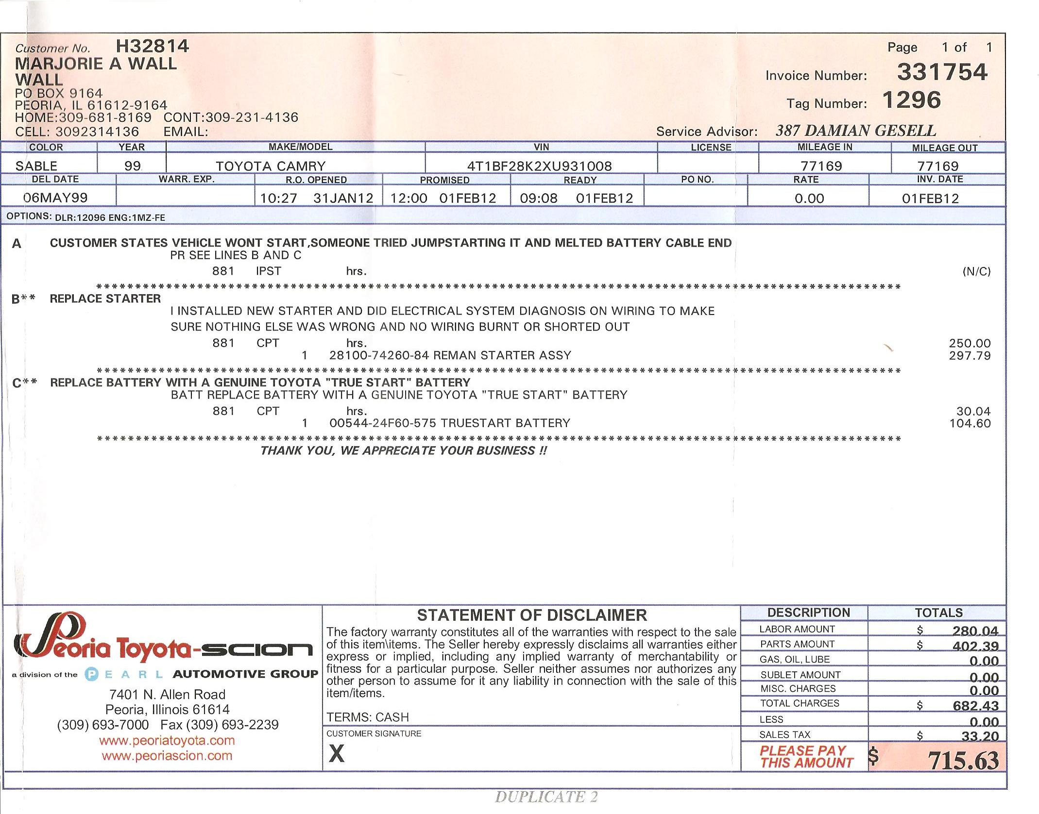 I have a 99 Toyota Camry, V6 with only 76K miles. The Toyota dealership wants $750 to replace the battery and the starter. I have no idea if this is even a reasonable price. Any thoughts?
