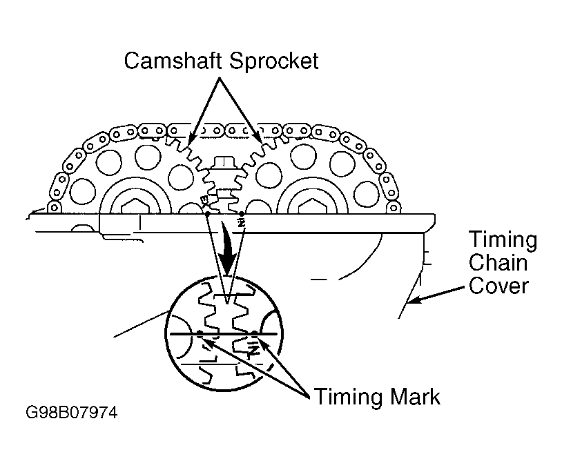 Ensure timing marks on camshaft sprockets are aligned and positioned in a straight line at top surface on timing chain cover. See Fig. 2. If timing marks are not as specified, rotate crankshaft clockwise one full revolution (360 degrees) and realign crankshaft pulley timing mark (groove) with "0" mark on timing chain cover and then recheck timing mark alignment. If timing marks are still not aligned, timing chain is incorrectly installed.