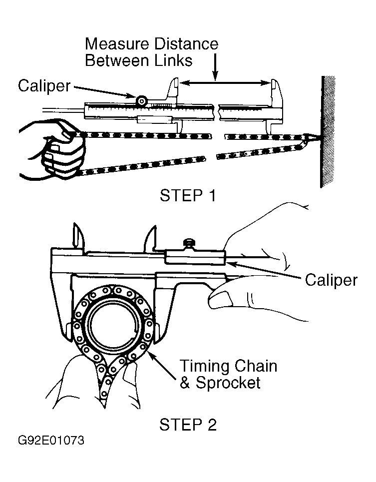 Ensure plunger on timing chain tensioner moves freely when pawl is pushed downward. Perform STEP 1 in illustration. See Fig. 25. Release pawl. Ensure plunger locks and will not move. Perform STEP 2 in illustration. See Fig. 25. Replace timing chain tensioner if defective. Check that oil jet on front of oil pump body is not restricted. See Fig. 43.