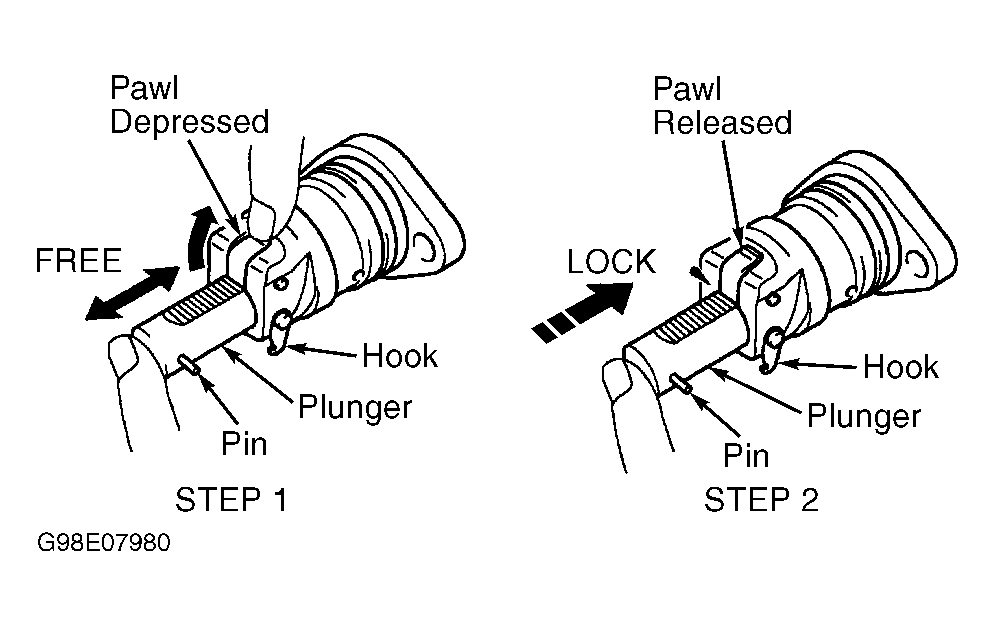 Install timing chain tensioner by hand until "O" ring on timing cEnsure plunger on timing chain tensioner moves freely when pawl is pushed downward. Perform STEP 1 in illustration. See Fig. 25. Release pawl. Ensure plunger locks and will not move. Perform STEP 2 in illustration. See Fig. 25. Replace timing chain tensioner if defective. Check that oil jet on front of oil pump body is not restricted. See Fig. 43.