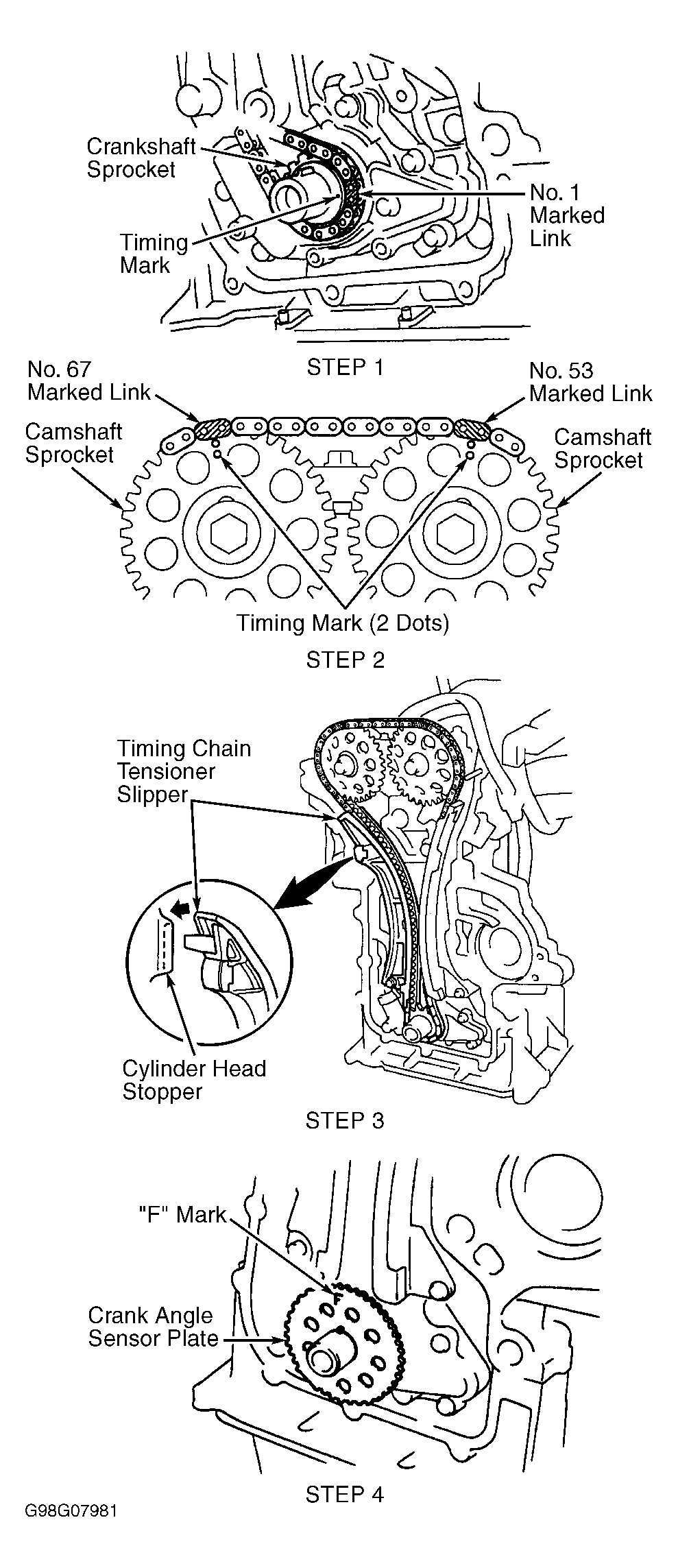 Install timing chain on camshaft so No. 53 and 67 marked links align with timing marks with the 2 dots on camshaft sprockets. Perform STEP 2 in illustration. See Fig. 26. Ensure tension exists on timing chain between crankshaft sprocket and camshaft sprocket on intake camshaft.