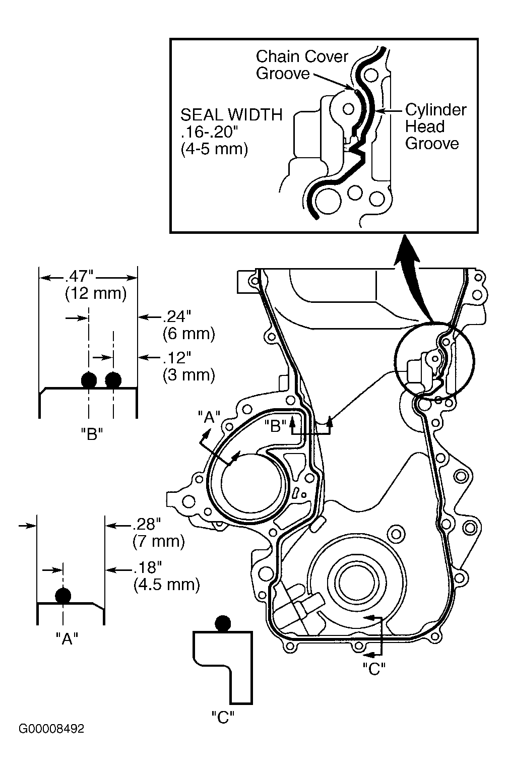 Ensure sealing surfaces on rear of timing chain cover and front of cylinder block and cylinder head are clean. Apply sealant on rear of timing chain cover and front of cylinder block and cylinder head at specified areas. See Fig. 27.
