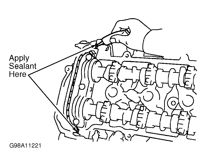 CAUTION:When installing timing chain cover, use care not to allow timing chain and timing chain tensioner slipper to contact sealant surfaces on timing chain cover. After installing timing chain cover and water pump, the accessory drive belt tensioner and right (timing chain side) engine mount bracket must be installed within 15 minutes.