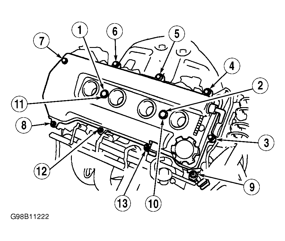 Before installing valve cover and gasket, apply sealant at specified areas on cylinder head. See Fig. 8. Install gasket, valve cover, seal washers, bolts and nuts. Tighten valve cover bolts/nuts to specification in sequence. See Fig. 9. See TORQUE SPECIFICATIONS. To install remaining components, reverse removal procedure. Tighten bolts/nuts to specification. See TORQUE SPECIFICATIONS. Fill cooling system.