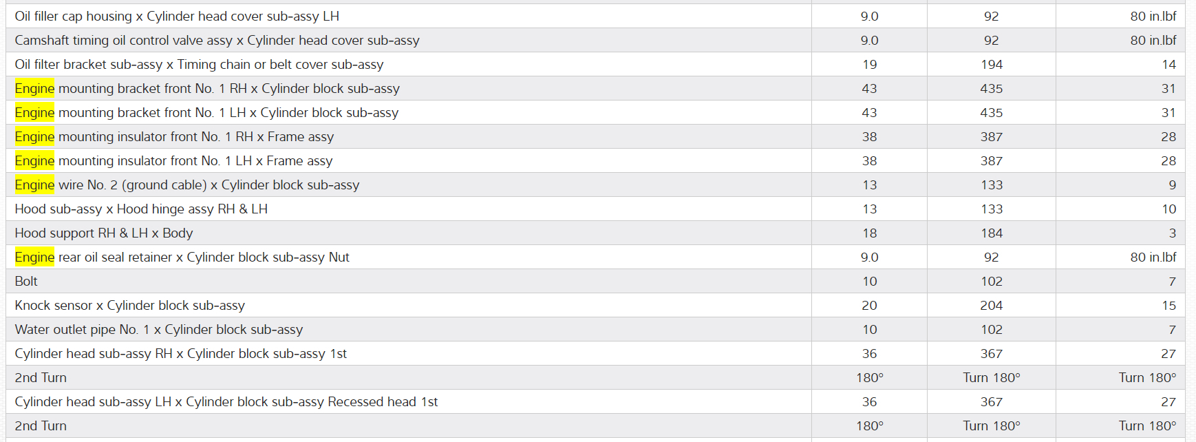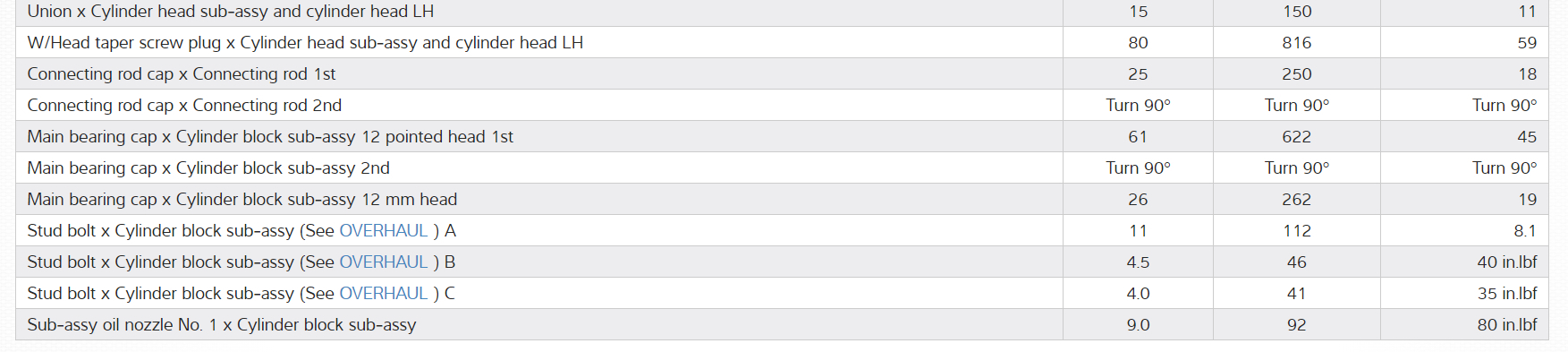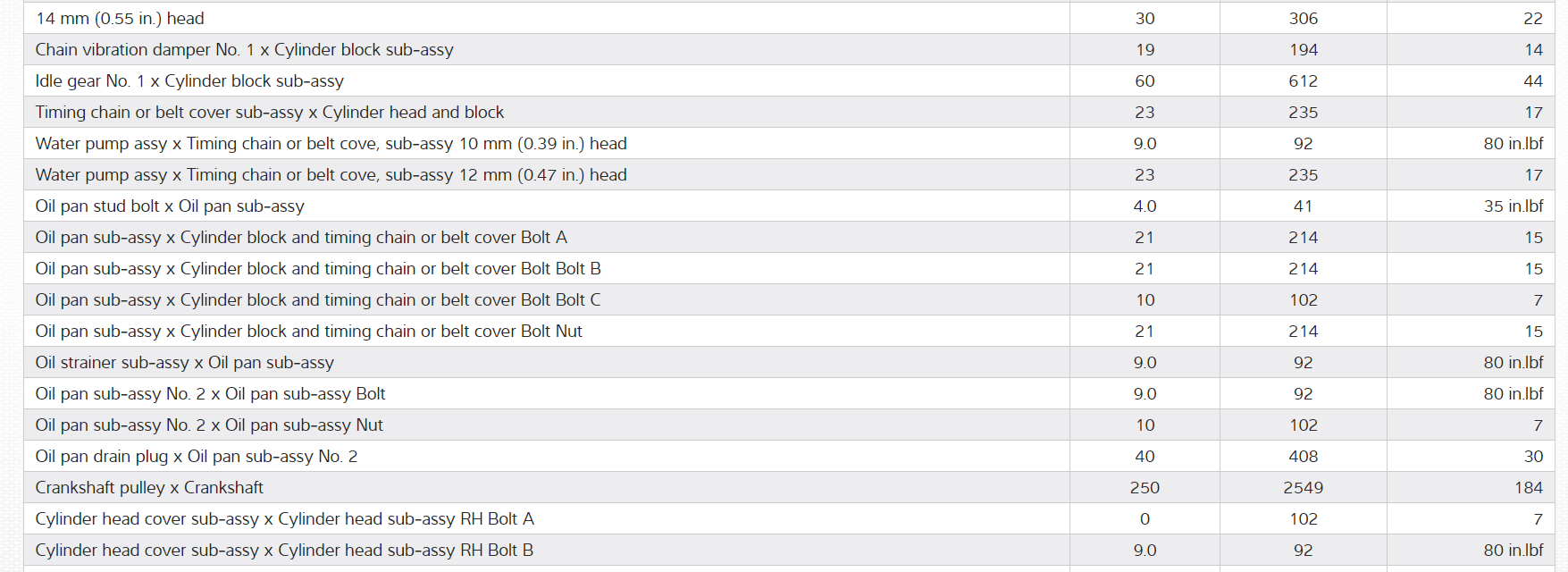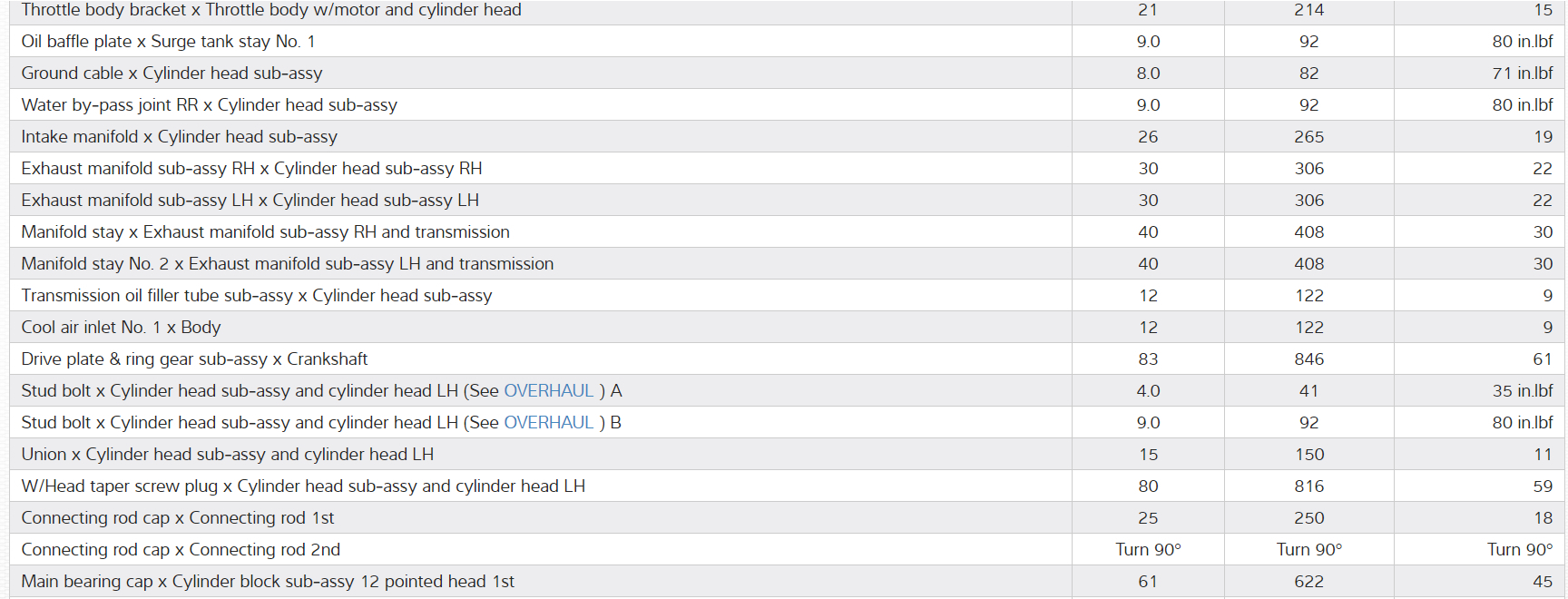 I found all engine torque specs some are toque then turn 90 degrees so be careful. Here is a video to show how to use a torque wrench and the full specs in the diagrams below: