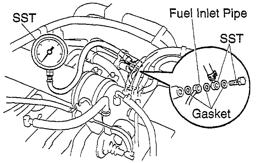 14. After checking fuel pressure, disconnect the negative (-) terminal cable from the battery and carefully remove the SST to prevent gasoline from splashing. SST O9268-45012