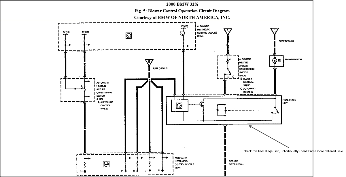 I have a 2000 Bmw 328i (e46) and my blower motor isn't working. The head unit is working and I''ve replaced the FSU (blower motor resistor) and the blower motor itself. The fuses are good and there is power to the blower motor plug. I've also direct wired the blower motor and it works just fine. I'm absolutely stumped! Help!