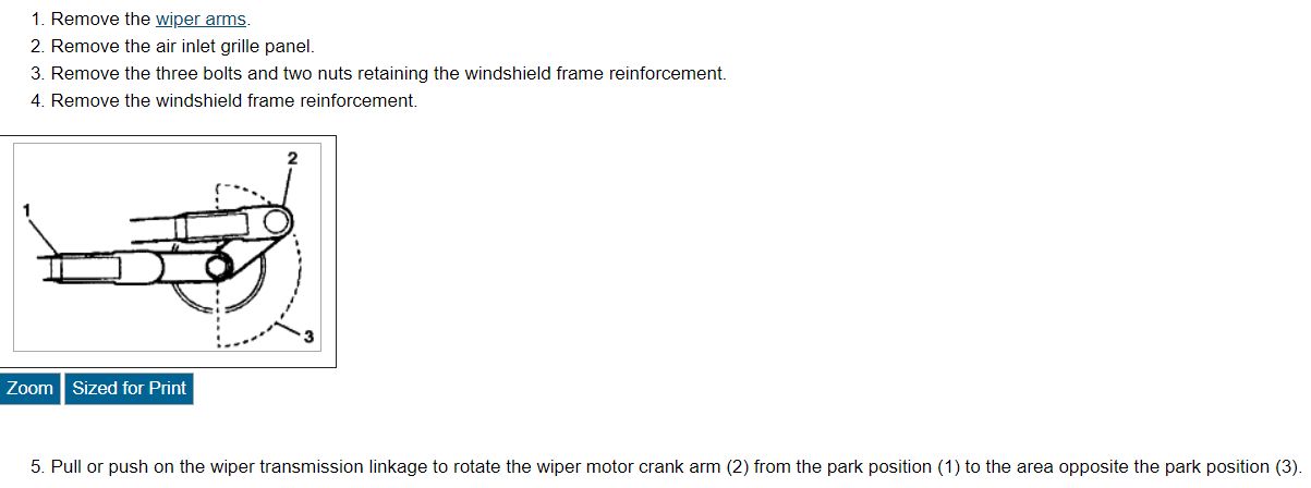 Pull or push on the wiper transmission linkage to rotate the wiper motor crank arm (2) from the park position (1) to the area opposite the park position (3).