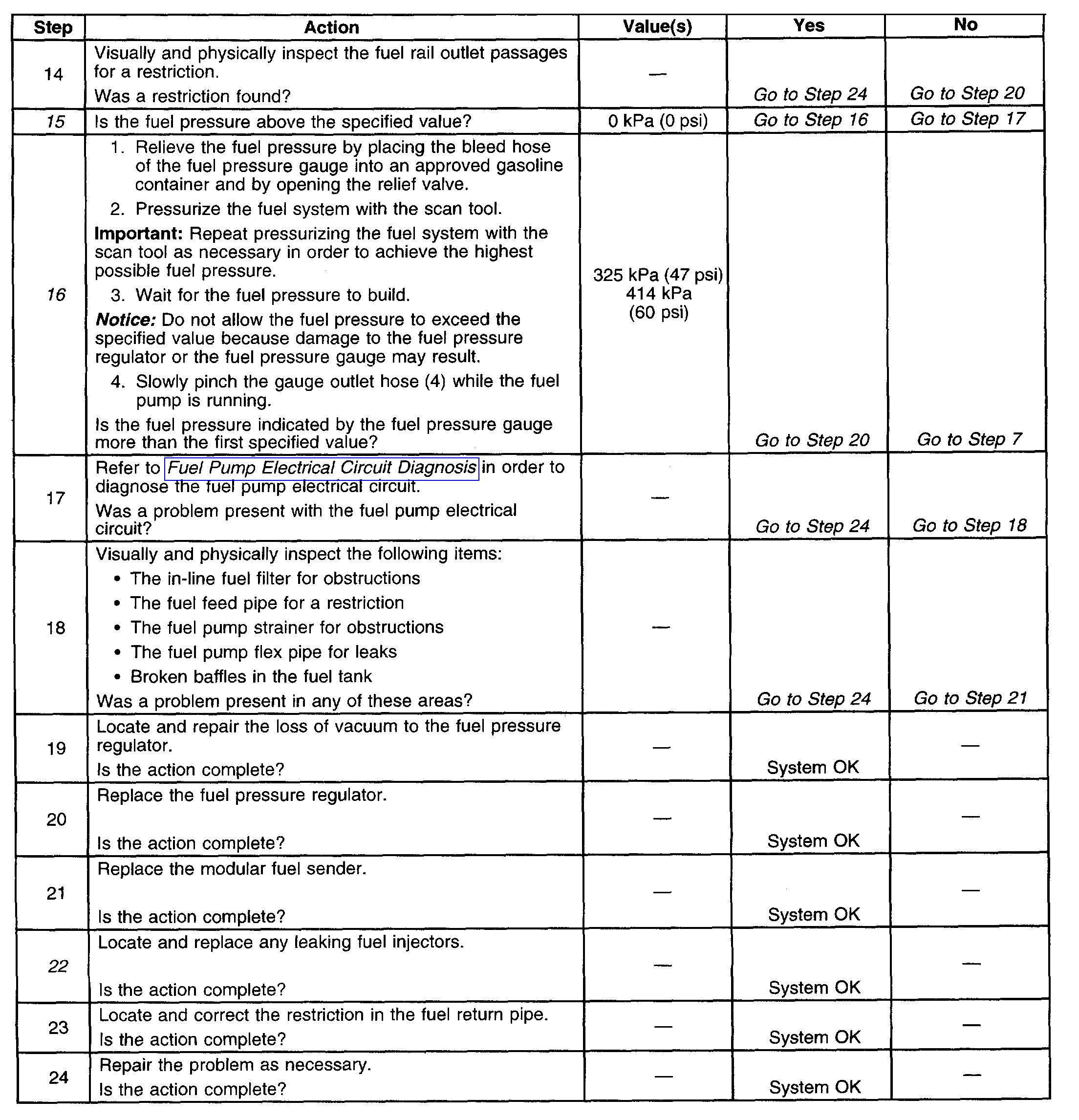 13. This test determines if the high fuel pressure is due to a restricted fuel return pipe or if the high fuel pressure is due to a malfunctioning fuel pressure regulator.