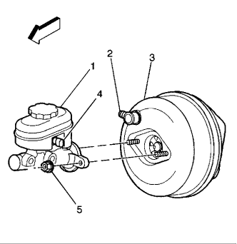 Remove the brake pipe tube nuts (3, 4) from the master cylinder assembly.