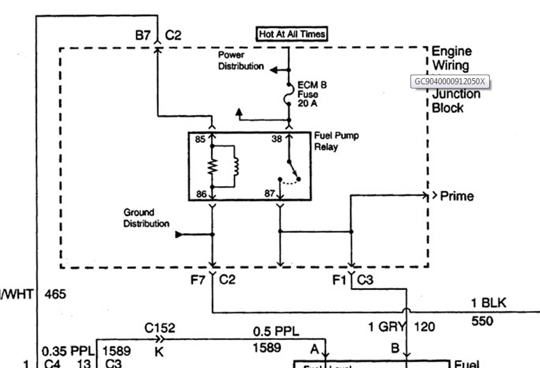 IN the diagram, check the ecmb fuse for voltage, hot all time. At the fuel pump relay, unplug the relay, use a jumper on the load side of relay. The load side of relay is the line with arrowhead, When relay is energized that line moves to other terminal, carries to fuel pump, on gray wire. At the fuel pump connector, black wire is ground. If the pump wont run with the jumper, then possible problem with wiring circuit to pump--wiring connector-- ground.