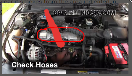 Whenever I crank my car it smokes from the area indicated in the photo. Everything is full as it should be. Coolant, oil, brake fluid, etc. What's the problem? I'm scared to drive the car thinking something will go wrong. Please help! Thanks.