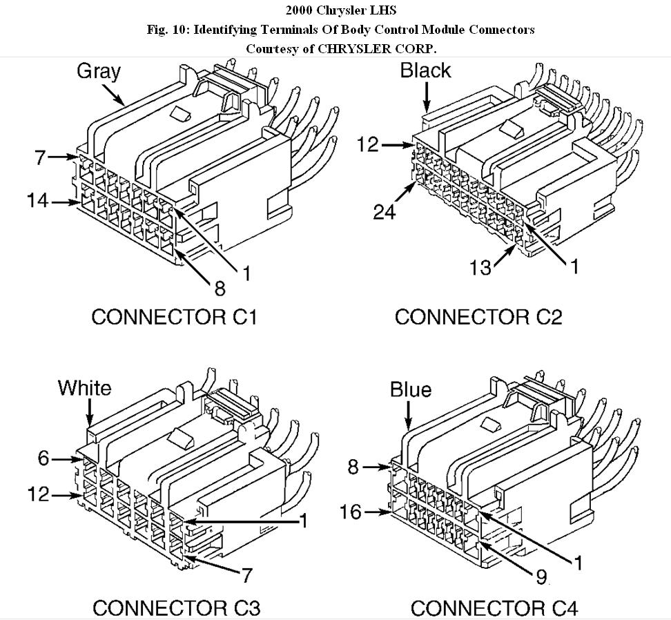 17. Disconnect BCM connector C1. Measure resistance between BCM connector C1 terminal No. 8 (Dark Blue/Gray wire) and BCM connector C2 terminal No. 9 (Yellow/White wire). See Fig. 10. If reading is 1000 ohms or more, go to next step. If reading is less than 1000 ohms, repair short between Dark Blue/Gray wire and Yellow/White wire. After repair, go to step 20.