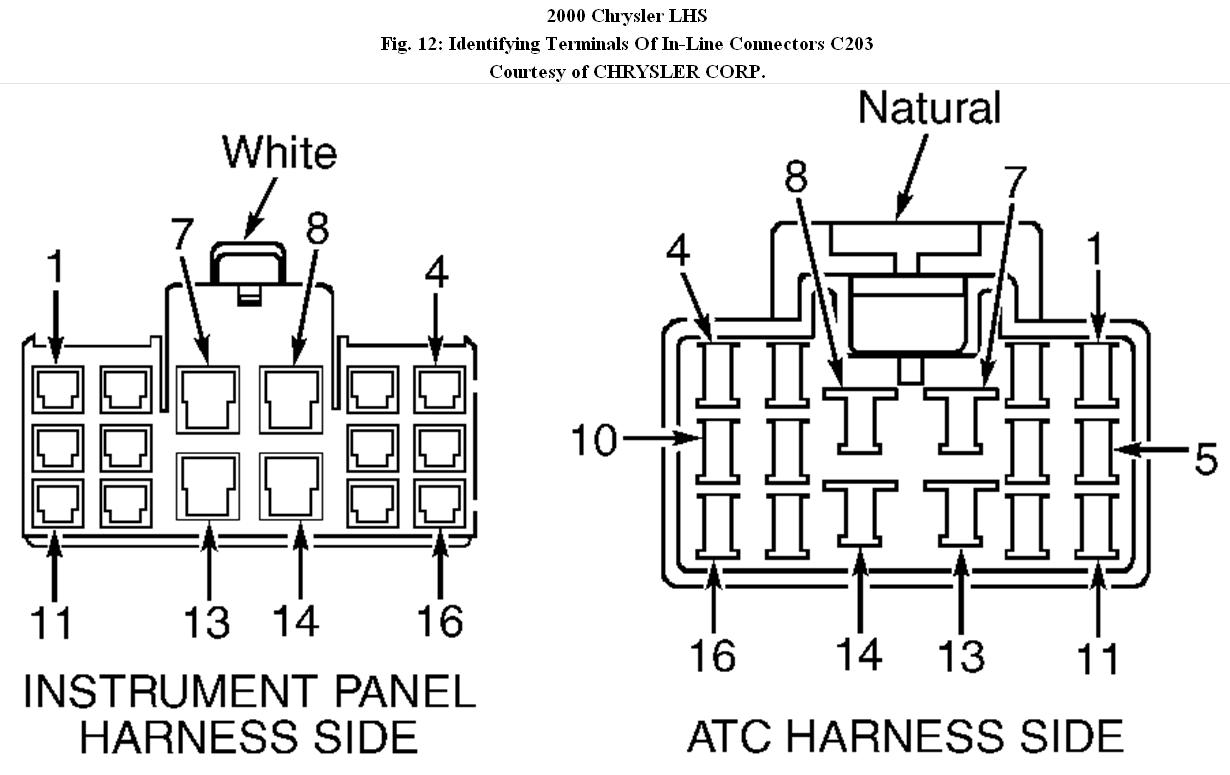 8. Turn ignition switch to OFF position. Disconnect in-line connector C203. See Fig. 12. Ensure all lighting is turned off. Close all doors (dome light off). Measure resistance between ground and instrument panel harness side of in-line connector C203 terminal No. 5 (Dark Blue/Gray wire). See Fig. 12. If reading is less than 5 ohms, go to next step. If reading is 5 ohms or more, go to step 14.