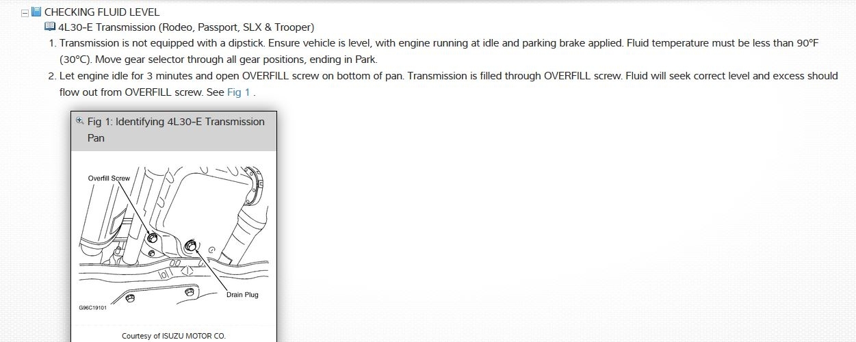 1. Transmission is not equipped with a dipstick. Ensure vehicle is level, with engine running at idle and parking brake applied. Ensure fluid temperature is less than 90°F (30°C). Move gear selector through all gear positions, ending in "P" position.