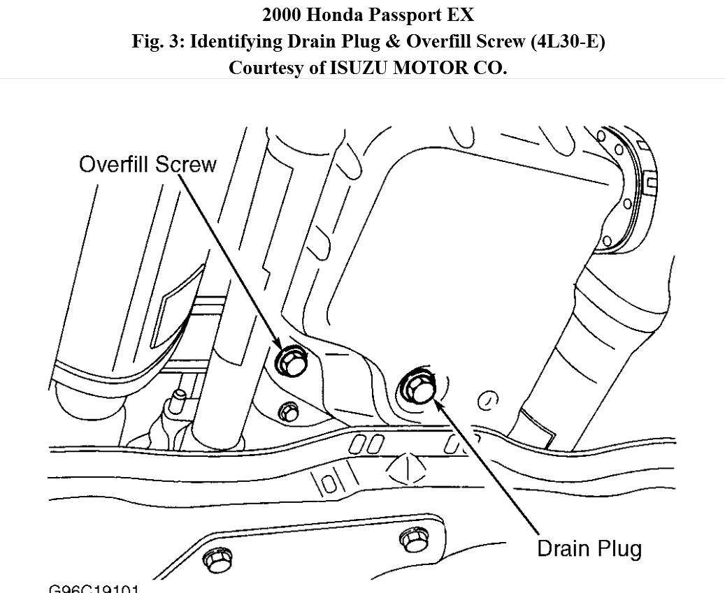 2. Let engine idle for 3 minutes and open overfill screw on bottom of pan. Transmission is filled through overfill screw. Fluid will seek correct level and excess should flow out from overfill screw.