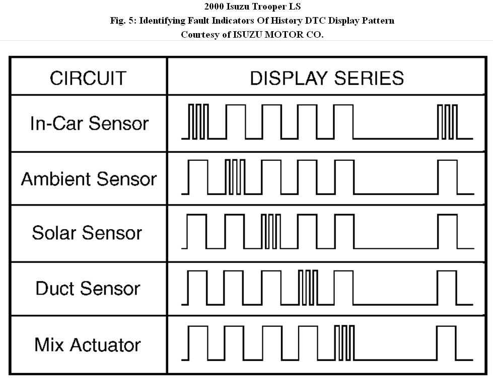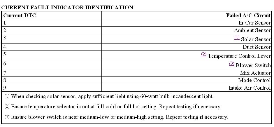 2. A normal indicator flash consists of a.5 second on, .5 second off pulse. Each indicator flash represents a circuit monitored by automatic A/C control unit. A normal pattern (with no current DTCs present) consists of 9 indicator flashes, then pause for 3 seconds before repeating. A fault indicator is identified by 3 rapid flashes in the place of a normal indicator flash. See Fig. 3.