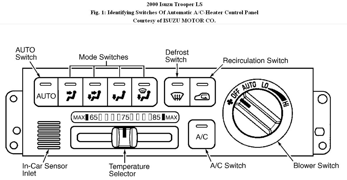 1. Turn ignition switch to OFF position. Place A/C-heater control panel blower switch and temperature selector at mid-range settings. While holding down both the AUTO switch and defrost switch at control panel, start engine. See Fig. 1. Continue to hold switches down until A/C switch LED indicator begins to flash (within 10 seconds), then release switches. Monitor and identify A/C switch LED flashing sequence through a series of indicator flashes (1-9), followed by a 3 second pause, then sequence will repeat.