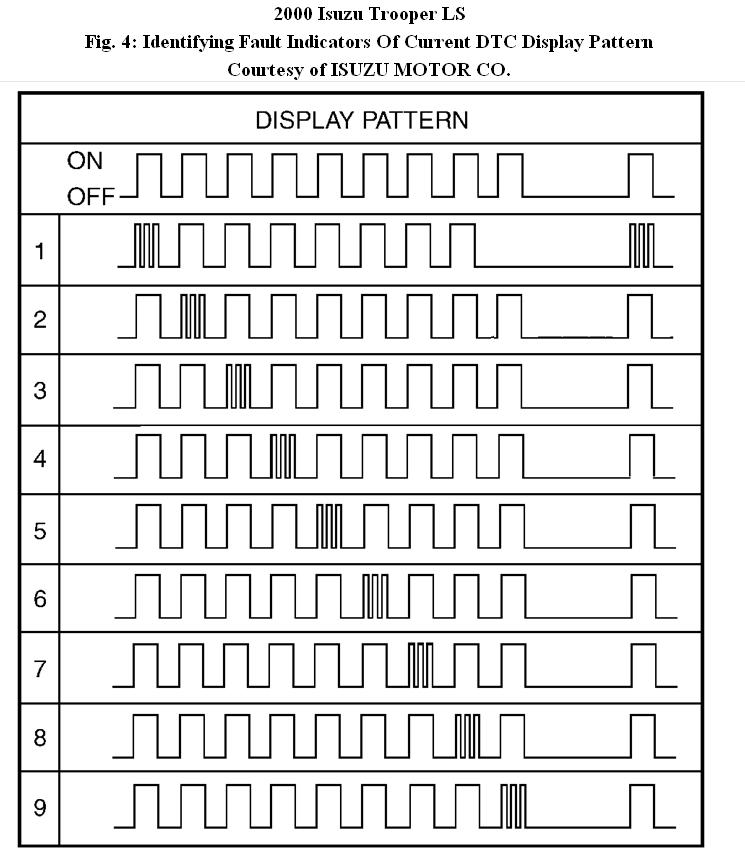 3. Monitor current DTC display patterns of 9 indicator flashes. Check if any fault indicators are present during display pattern. If any fault indicator(s) are displayed, verify which indicator (1-9) is displaying a current DTC. See Fig. 4.