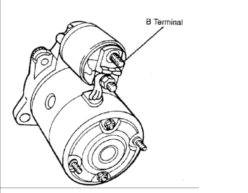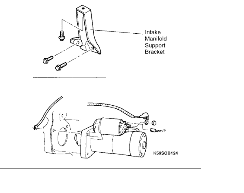 2. On all models, remove lower intake manifold bracket bolts and bracket. Remove 2 upper starter bolts and a lower bolt. Pull starter from clutch (M/T) or converter (A/T) housing and prop in place. From above, disconnect starter solenoid "S" and "B" terminal connectors. From below, push transmission harness aside and remove starter.
