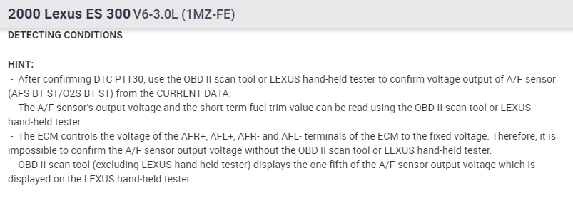 P1130 - A/F (air / fuel ratio) sensor circuit range / performance malfunction (bank 1 sensor 1).