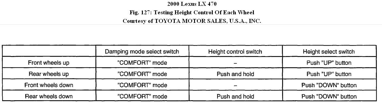 3. Operate each switch and check operation of height control of each wheel. See Fig. 127.