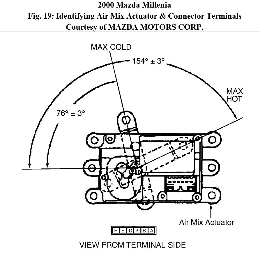 1. Remove dashboard. Disconnect air mix actuator harness connector. Apply battery voltage to terminal "F" of air mix actuator harness connector, and ground to terminal "E". See Fig. 19. Ensure air mix door moves to full cold position.