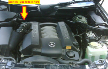 The transmission fluid dipstick is located toward the back of the engine, close to the firewall. See picture below for reference.