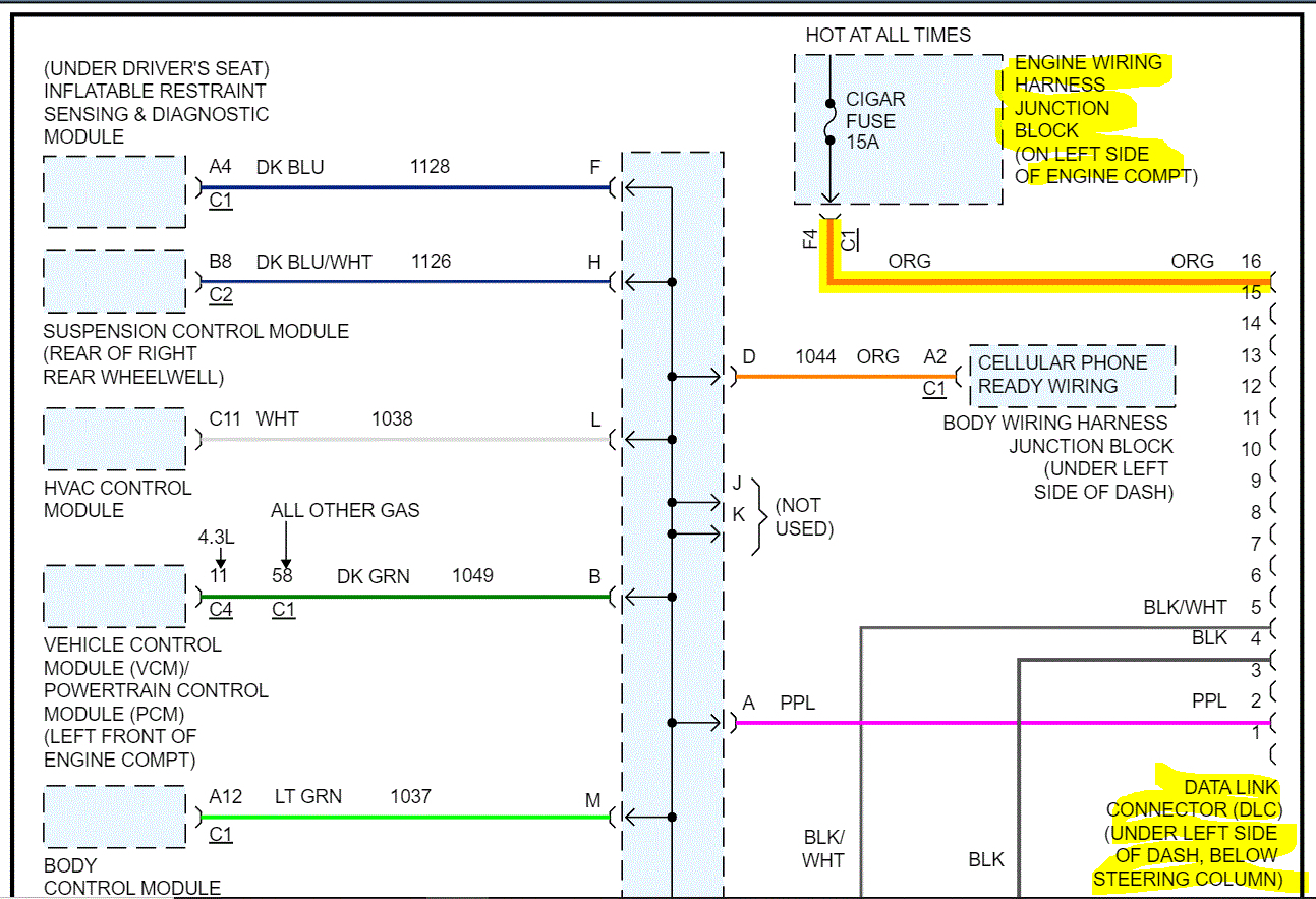 First, I attached the schematic for the DLC. Pin 16 should have 12v at all times. It is powered by the (don't laugh) cigar fuse under the hood. See pics 1 and 2.