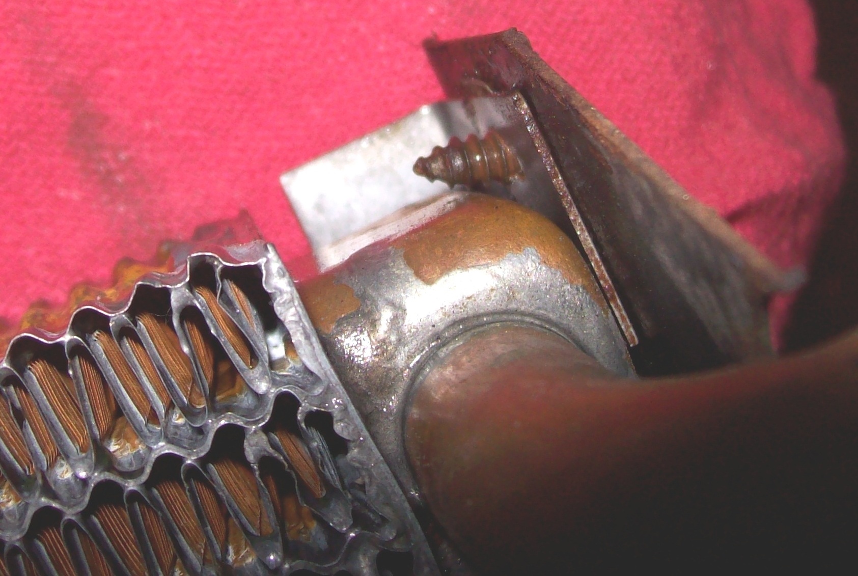1) HERE'S WHAT I DISCOVERED THE 1ST TIME I PULLED MY DASH AND HEATER (THIS IS MY #6 JEEP). THIS SCREW WAS SCREWED AGAINST THE CORE----IT FINALLY STARTED LEAKING AFTER YEARS OF EXPANSION AND CONTRACTION.I AIMED IT SLIGHTLY THE OTHER WAY. IT'S CLOSE, BUT NOT TOUCHING!