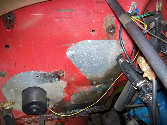 2) ON THIS MY PRESENT 1977 CJ 5, I'VE HAD IT SINCE THE EARLY '90s, I'M ALWAYS TRYING TO IMPROVE ON IT. I INSTALLED A "BETTER" HEATER OUT OF AN '82. WHILE I HAD IT OUT. I MODIFIED THE BACK OF THE HEATER, THEN TRANSFERRED MEASUREMENTS TO THE FIREWALL. THIS TOOK A COUPLE OF WEEKS FOR THE WHOLE PROCESS. I MADE "ACCESS PORTS" IN THE FIREWALL. NOW I REMOVE THE BATTERY TRAY AND I AM ABLE TO GET TO THE FAN AND THE CORE, WITHOUT RIPPING OUT THE DASH AND HEATER UNIT. IN THIS PIC, YOU CAN SEE A "IN A HURRY" MESS UP. SEE THE LEAK ON MY PANEL. SHARP EDGE GOT IT!