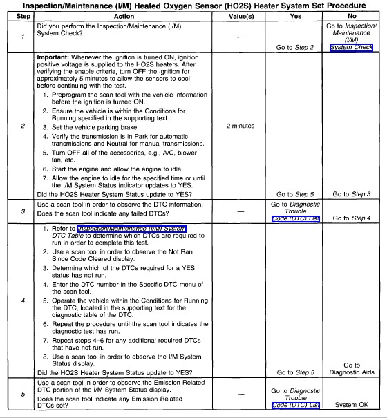 The purpose of this test is to satisfy the enable criteria necessary to execute I/M readiness diagnostics for the heated oxygen sensor (HO2S) system. The test may be used to set the I/M System Status to YES. Ensure the vehicle meets the requirements listed in Conditions for Running before performing this test. Failure to meet the necessary requirements may produce inaccurate lest results.