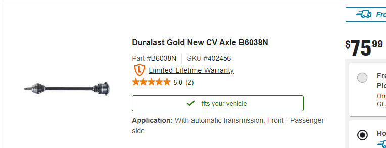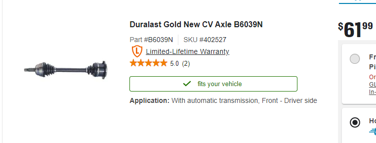 Try the Rock Auto web site. Make the selections through the drop-down menus, then you'll find the half shafts listed under the "Drivetrain" selection.