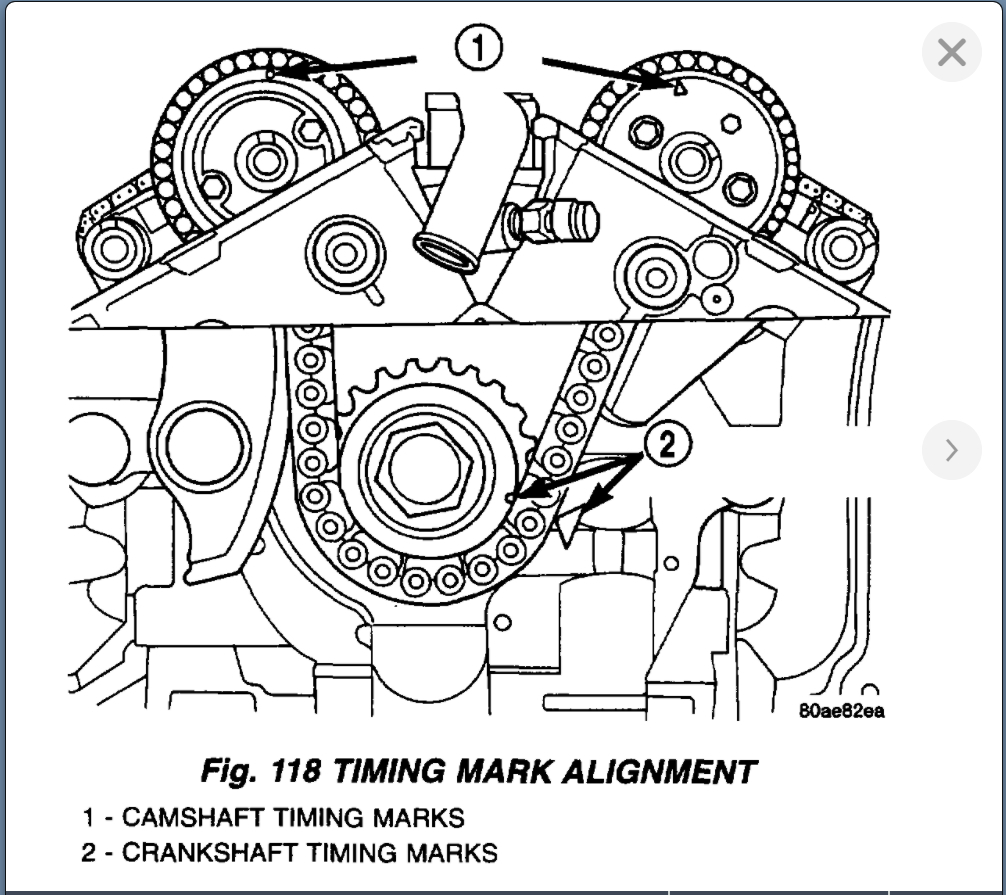 Remove upper radiator crossmember. Disconnect fan assembly connector. Remove fan assembly. Remove drive belts. Using Crankshaft Pulley Holder (8191), hold crankshaft pulley and remove center bolt. Using a 3-jaw puller, remove crankshaft pulley. Remove upper intake manifold. See INTAKE MANIFOLD. Remove electrical and vacuum harness retaining clips from valve cover studs. Remove ignition coils. Remove valve covers. Remove power steering pump, and set aside. Remove drive belt tensioner pulley and bracket. Remove timing chain cover. CAUTION:DO NOT turn camshaft. Rotate engine by turning crankshaft. Align crankshaft sprocket timing mark to mark on oil pump housing. Mark on oil pump housing is 60 degrees ATDC of number one cylinder. See Fig. 9. Fig. 9: Identifying Primary Timing Chain Aligning Marks Courtesy of CHRYSLER CORP. CAUTION:When timing chain is removed and cylinder heads are installed, DO NOT rotate camshafts or crankshaft without first locating proper crankshaft position. Remove primary timing chain tensioner from right cylinder head. Remove camshaft position sensor from left cylinder head. Remove chain guide access plug from left cylinder head. See Fig. 10. Remove right camshaft sprocket bolts and sprocket. When camshaft sprocket bolts are removed, camshaft will rotate clockwise. Remove left camshaft sprocket attaching bolts and sprocket. Remove lower chain guide and tensioner arm. Remove primary timing chain. Fig. 10: Exploded View Of Primary Timing Chain Components Courtesy of CHRYSLER CORP.
