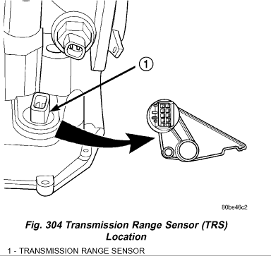 The Transmission Range Sensor (TRS) is mounted to the top of the valve body inside the transaxle and can only be serviced by removing the valve body. The electrical connector extends through the transaxle case (Fig. 304).