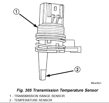 The TRS has an integrated thermistor (Fig. 305) that the TCM uses to monitor the transmission's sump temperature. Since fluid temperature can affect transmission shift quality and convertor lock up, the TCM requires this information to determine which shift schedule to operate in. The PCM also monitors this temperature data so it can energize the vehicle cooling fan(s) when a transmission "overheat" condition exists. If the thermistor circuit fails, the TCM will revert to calculated oil temperature usage.