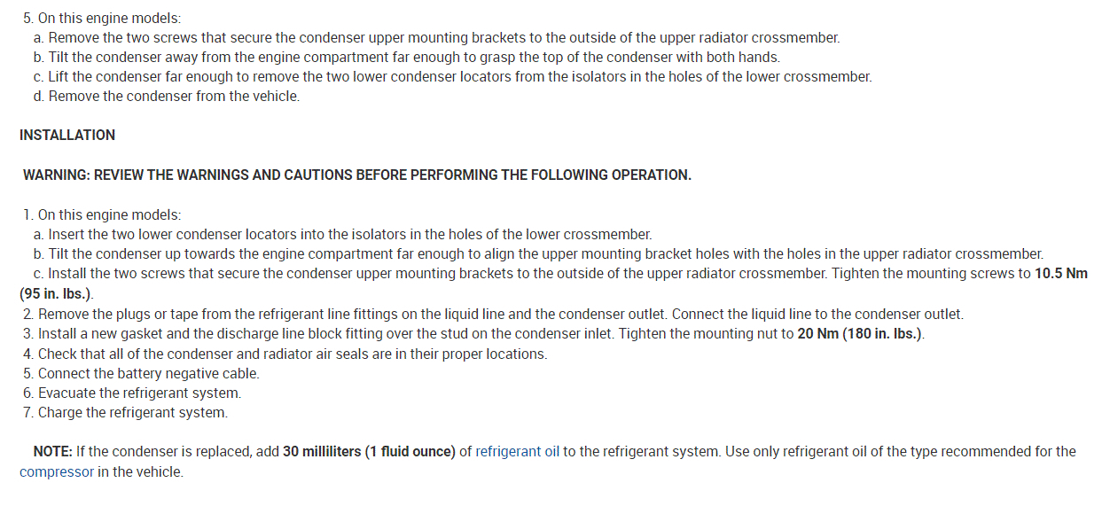 If you look at the pics below, they include the directions and pictures specific to your vehicle for condenser replacement.