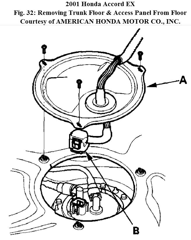4. Remove the trunk floor and the access panel (A) from the floor. Disconnect the fuel tank 5P connector (B).