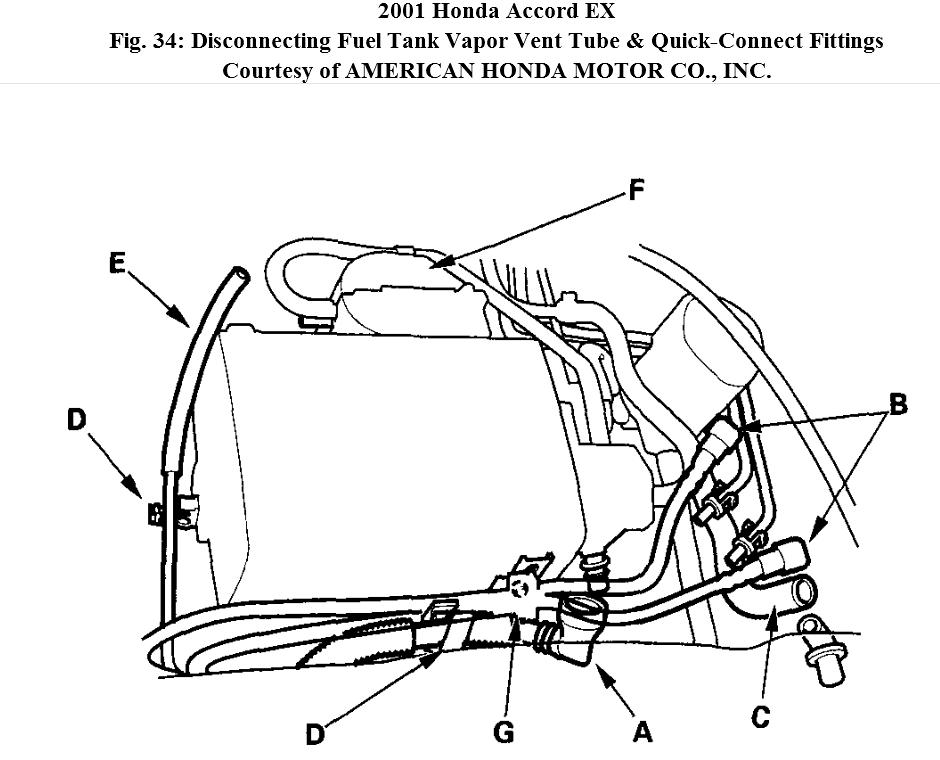 9. Disconnect the fuel tank vapor vent tube (A) and the quick-connect fittings (B). Disconnect the hose (C). Remove the hose from the line holder (D). Disconnect the hose (E) from the EVAP two way valve (F). Remove the line holder (G).