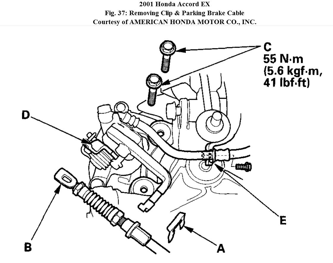 12. If the vehicle has rear drum brakes, go to step 14. If it has rear disc brakes, remove the clip (A) and parking brake cable (B), two caliper bolts (C), caliper body (D), and brake hose bracket (E).