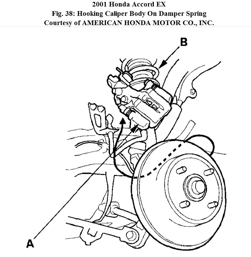 13. Hook the caliper body (A) on to the damper spring (B). Go to step