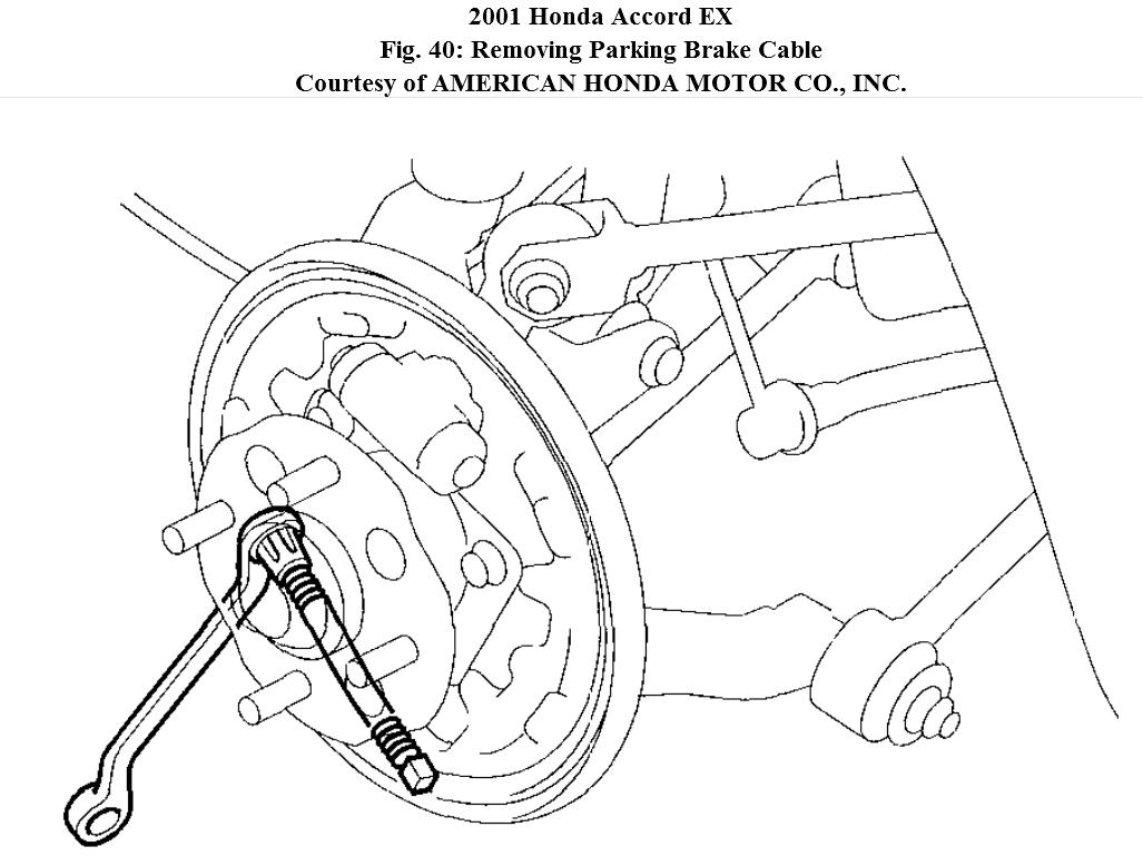 15. Remove the brake drum and brake shoes. Remove the two mounting bolts for the parking brake cable from the backing plate, then remove the parking brake cable using a 12 mm offset wrench.