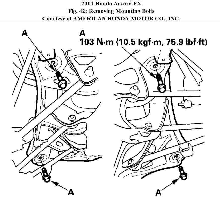 17. Place a jack or support under the rear suspension sub frame. Remove the mounting bolts (A) (4 cylinder: four bolts; shown, V6: twelve bolts; not shown). Remove the rear suspension sub frame.