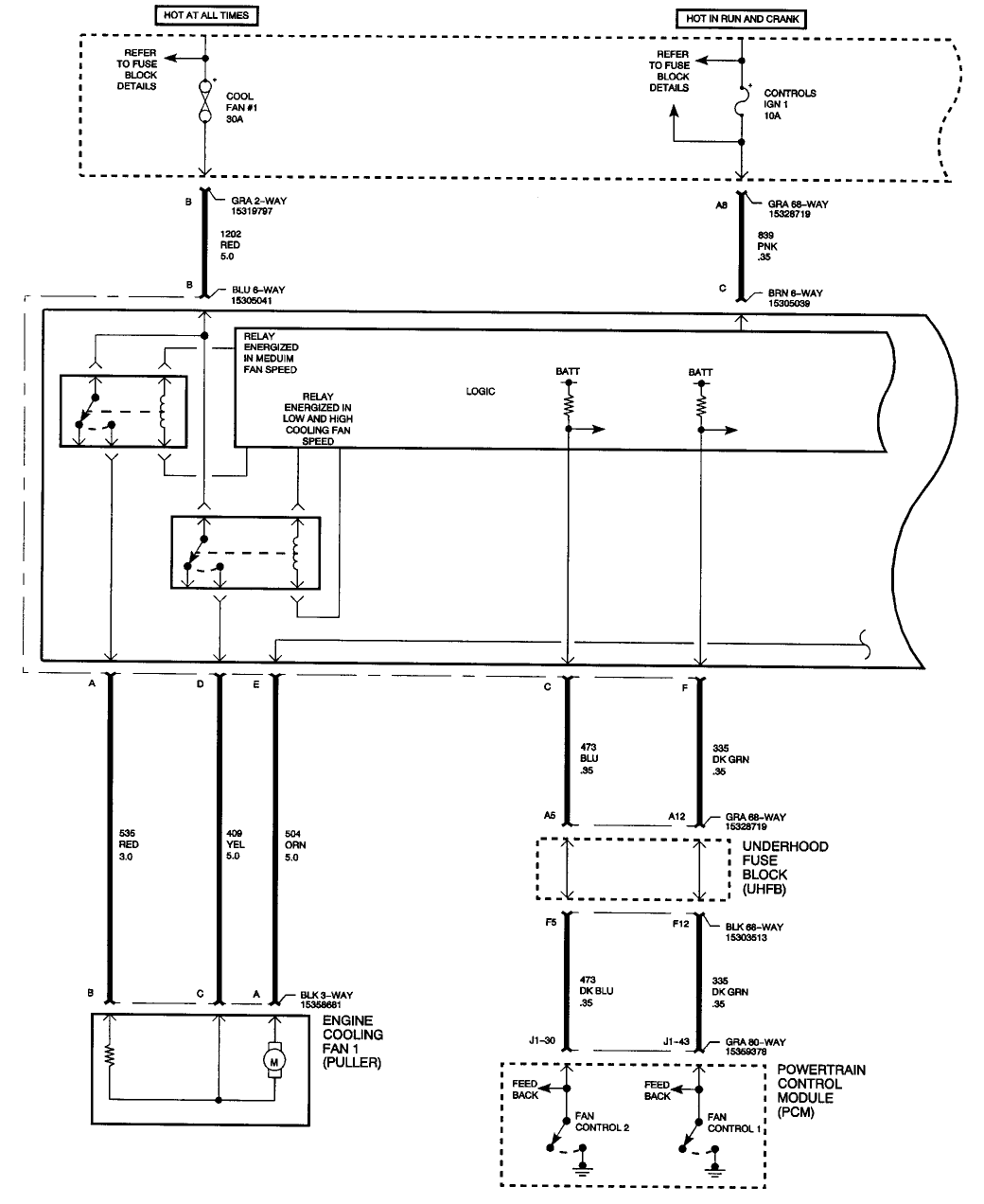 This is in response to ASEMaster6371: With all do respect the schematic and response does NOT apply to the actual wiring on my automobile. This is the information for my auto: 2001 Saturn L200 VIN #1G8JU52F11Y588253, Production Date 06-01 "F" Engine 2.2 4 Cyl. The Part Number on the Module is 1293 9022. This unit has 9 wires going to it. It has 2 connectors, The Brown connector has 4 size 10/12 wires as follows: Pin A Black, Pin B Grey, Pin D Red, Pin E light Green. The Blue Connector Has 5 wires going to it as Follows:Pin A Grey 10/12 wire. Pin B Red 10/12 wire, Pin C Black 18 wire, Pin D Grey 10/12 wire Pin E White 10/12 wire. ( Wire size Commercial AWG ). The condition I have is intermittent. At random times the pusher and puller fan go to high speed (even going down the road (50+ MPH). At this time the engine runs normal, even at idle, the temp gage reads normal. I have removed the circuit board from the protective case. There are no burned or hot spots on the circuit board. The circuit board has 5 relays HARD wired to it. I have done the shake/tap test with no help. I have checked the wiring from the module to the cooling fans, wiring from the coolant sensor to the PCM, Wires from Th PCM to the module. The car has NEVER been in a accident Please advise. I need all the help I can get. There are not any Saturn Dealerships any more. Some Chev dealers handle Saturn Warranty work but none here have any Technicians that are familiar with a 12 year old car. Thank you in advance. Darryl Kazemba Memphis Tn. Area. 901 432 6105