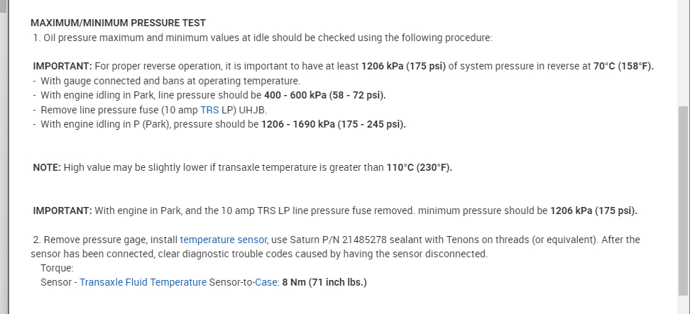 Backing out of the driveway the reverse pressure is 240 psi. I put the car into drive 100 psi. I go down the road the car shifts to second and goes to 240 psi. I pick up a little speed and the car go 100 psi and high rev's but does not shift. It stays that way (high rev's) until I stop and then the pattern repeats.