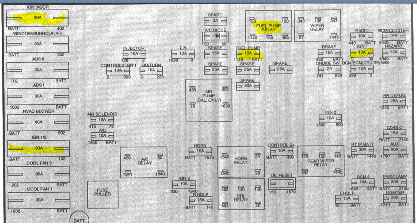 Let me know that info when you can. In the interim, I need you to start by checking a few different fuses and a relay. The fuses are in the under hood fuse / relay box. See pic 1.